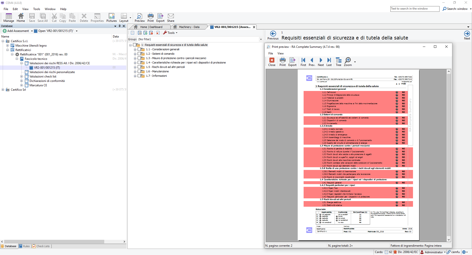 From Rel 4.5.3 of CEM4, to facilitate immediate understanding of the Risk Assessment has been prepared a new report "RA Complete summary", with which, in addition to the existing video display of the status of the ongoing, Applicability/Compliance with set values and controls in the preview CEM4, you can print/export the overall state of RA in a few pages, and to have an overview the trend/state of Risk Assessment, and not forcibly to all the print/export.